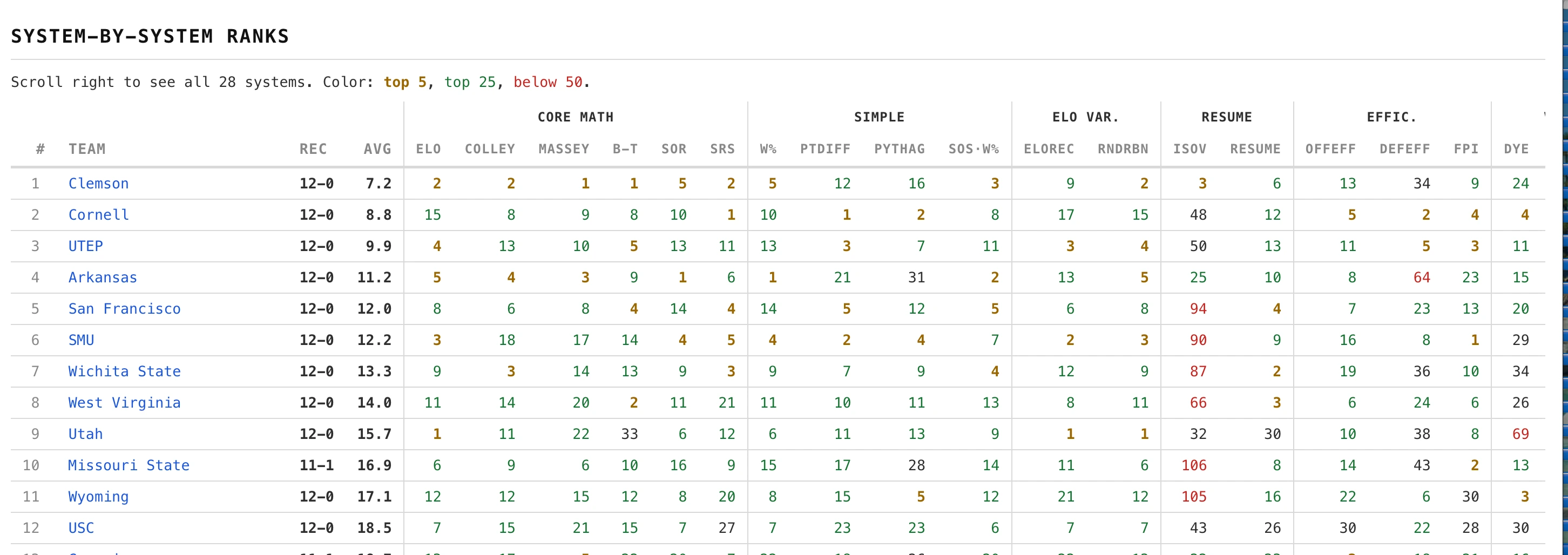 Kenneth Massey maintains a composite of computer ranking systems for college football. When he started in 1995, there were six or seven systems. By the time I joined, there were dozens. By 2012, over 100. The list includes independent methodologies built by people working across math, engineering, and hobbyist spaces. Entry requires a defined system and a public link.